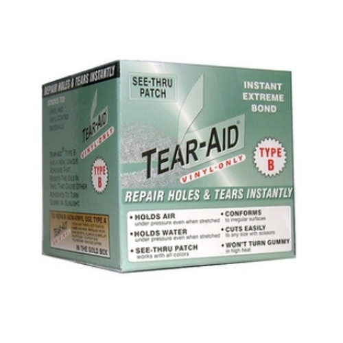 Tear-Aid® Original Type B repairs rips and holes in vinyl and vinyl coated surfaces. It is a peel and stick patch made from an exceptionally tough, matte finish, abrasion resistant, polyurethane elastomer that resists puncture and tearing.