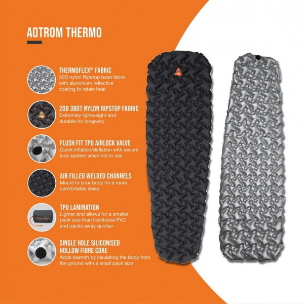 Vango Aotrom Thermo trek sleeping mat has advanced warmth properties as it features our new ThermoFlex® fabric with aluminium reflective coating, retaining heat and protecting you from the cold.