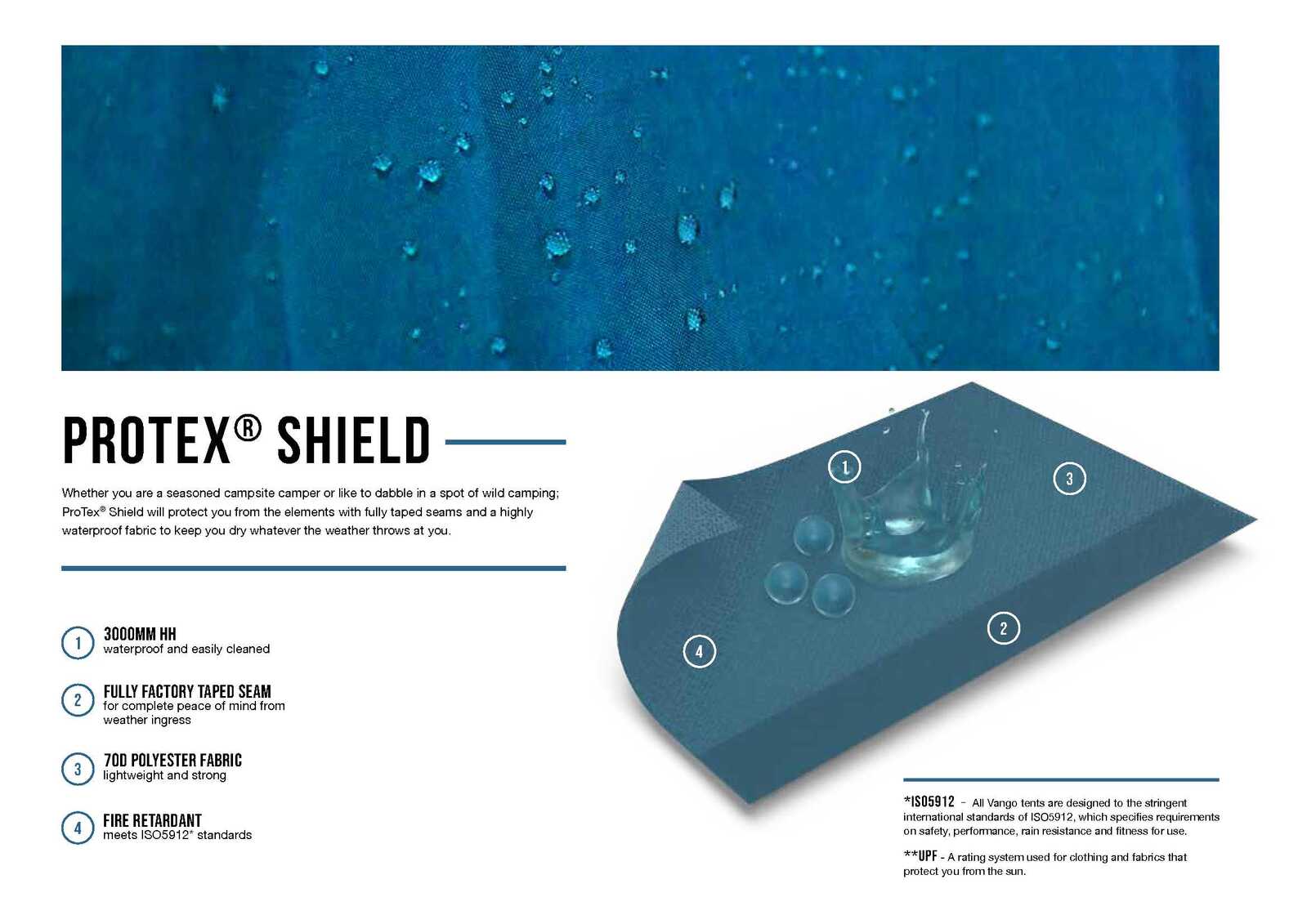 Simple to pitch, full stand up height in the living area, whilst the low-level of the spacious sleeping area keeps the pack size down. The flysheet is constructed in ProTex® Shield, making it highly waterproof and lightweight. Open the curtains to let sunlight flood through the Diamond Clear windows.