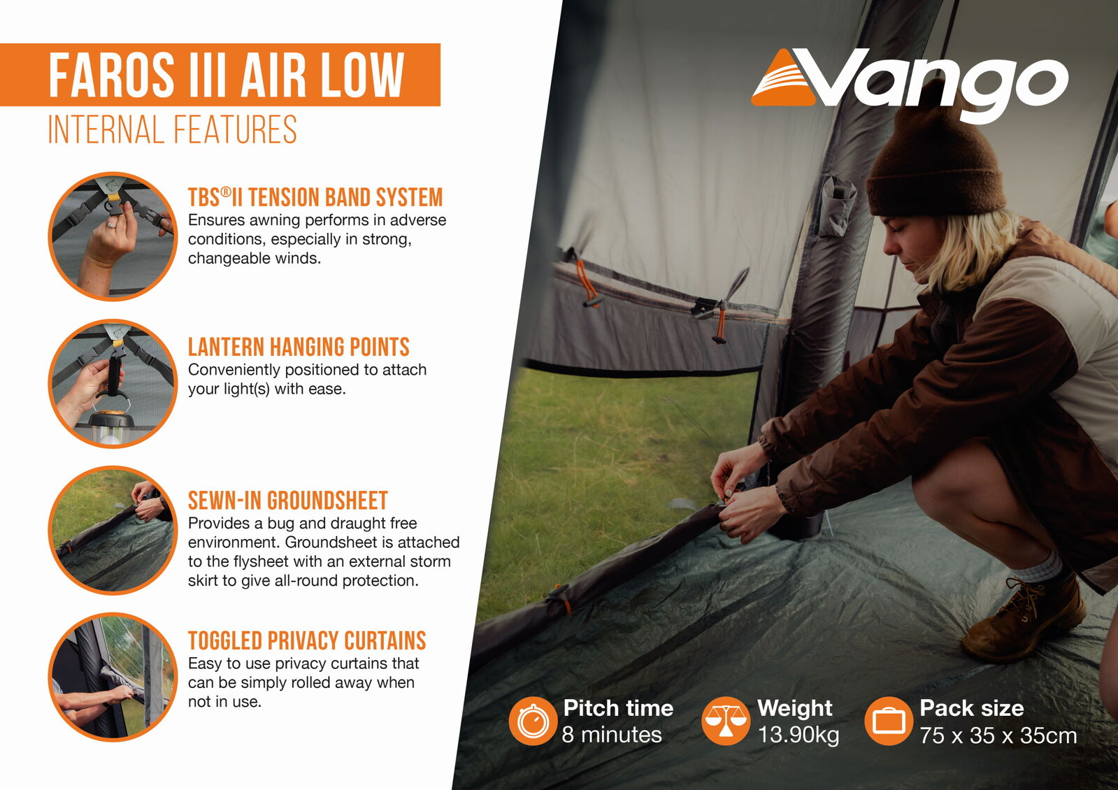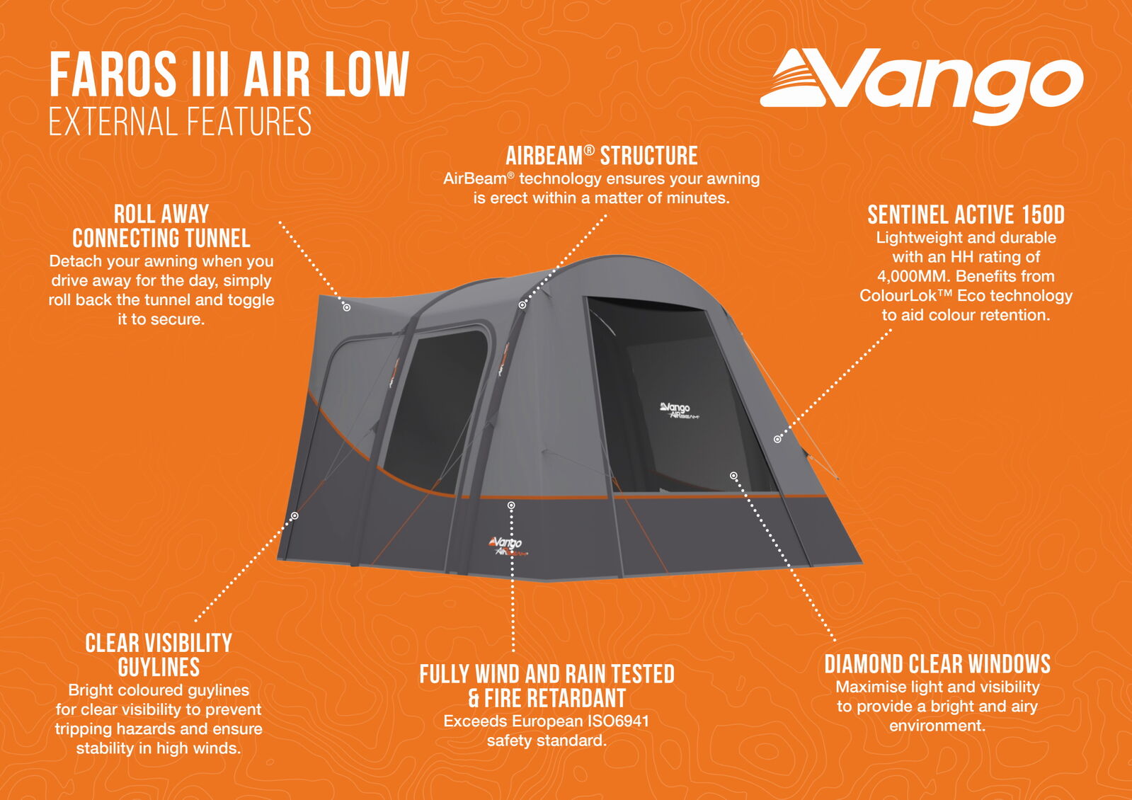 Utilsing Vango's AirBeam technology and Sentinel Active 150D fabric with ColourLok Eco, it is quick and easy to pitch while being light, durable and waterproof.