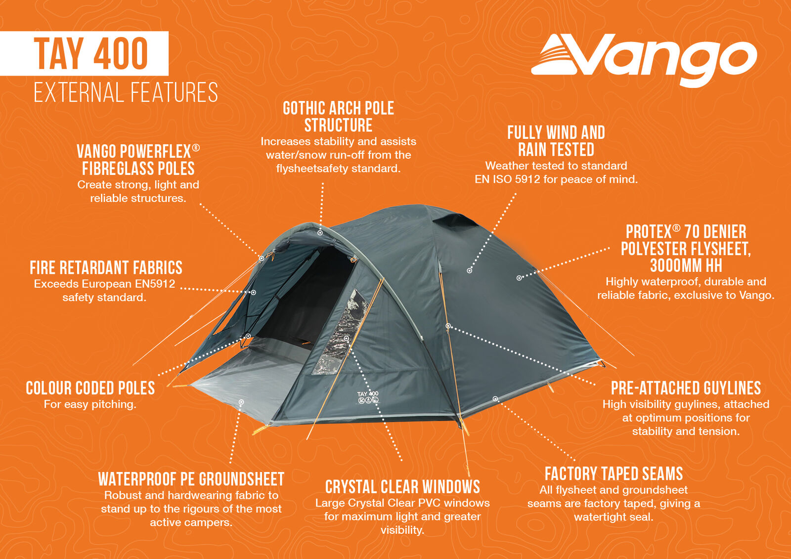 - Protex 70 Denier Polyester Flysheet, 3000mm HH - Highly waterproof, durable and reliable fabric, exclusive to Vango